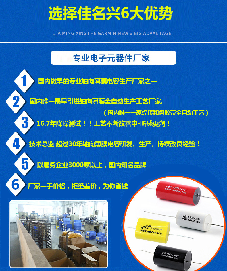 2017年12月28日正式更名為深圳佳名興電容有限公司 佳名興JMX廣東省惠州市電容器工廠占地面積13149平米,廠房面積8227平方米,每年生產(chǎn)的超級(jí)電容(單體、模組、方案定制)薄膜類電容(包括:金屬化薄膜電容、軸向薄膜電容,工業(yè)級(jí)電源用薄膜電容、長(zhǎng)壽命薄膜電容、等)軸向鋁電解電容、電力電容器、雙面金屬化薄膜電容等被動(dòng)元器件達(dá)8-13億只 佳名興JMX電容器60%-70%以上產(chǎn)品出口歐美,印度,東南亞等世界各地,30%-40%銷往中國(guó)大陸,產(chǎn)品規(guī)格齊全,體積小,可靠性優(yōu)良,穩(wěn)定性好,價(jià)格合理 佳名興JMX電容器被廣泛用于:汽車音響,車載分音器,音響分頻器,專業(yè)音響功放,衛(wèi)星通訊設(shè)備,LED驅(qū)動(dòng)電源,LED節(jié)能燈,開(kāi)關(guān)電源及電腦周邊產(chǎn)品等各個(gè)電子行業(yè)