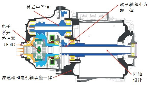 雪佛蘭(Chevrolet)Bolt變速器,輸入軸與輸出軸同軸。圖4為雪佛蘭Bolt同軸單擋變速器剖視圖。應(yīng)用在雪佛蘭Bolt純電動汽車上。