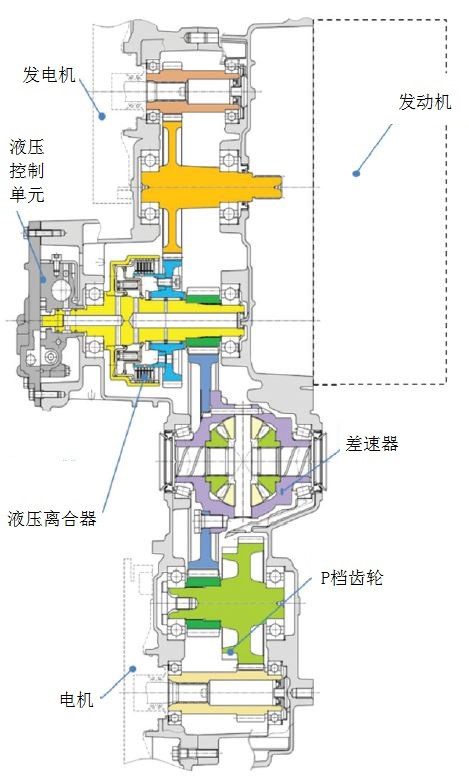 吉凱恩集成發(fā)動機(jī)電動機(jī)發(fā)電機(jī)的變速器,剖視圖如圖7所示。應(yīng)用在三菱歐藍(lán)德(Mitsubishi Outlander)混合動力汽車上。