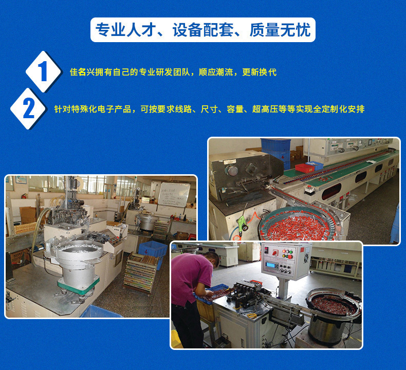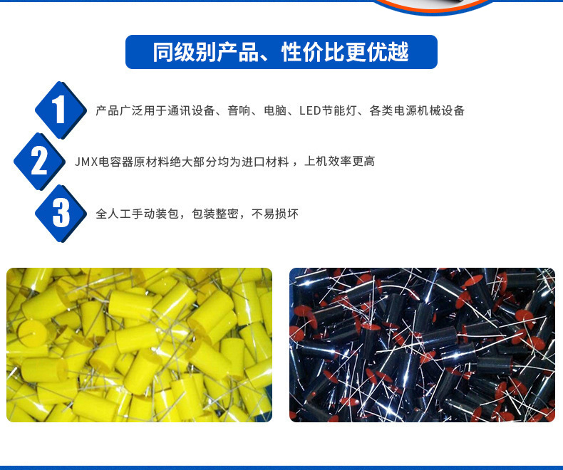 2017年12月28日正式更名為深圳佳名興電容有限公司 佳名興JMX廣東省惠州市電容器工廠占地面積13149平米,廠房面積8227平方米,每年生產(chǎn)的超級電容(單體、模組、方案定制)薄膜類電容(包括:金屬化薄膜電容、軸向薄膜電容,工業(yè)級電源用薄膜電容、長壽命薄膜電容、等)軸向鋁電解電容、電力電容器、雙面金屬化薄膜電容等被動元器件達8-13億只 佳名興JMX電容器60%-70%以上產(chǎn)品出口歐美,印度,東南亞等世界各地,30%-40%銷往中國大陸,產(chǎn)品規(guī)格齊全,體積小,可靠性優(yōu)良,穩(wěn)定性好,價格合理 佳名興JMX電容器被廣泛用于:汽車音響,車載分音器,音響分頻器,專業(yè)音響功放,衛(wèi)星通訊設備,LED驅(qū)動電源,LED節(jié)能燈,開關電源及電腦周邊產(chǎn)品等各個電子行業(yè)